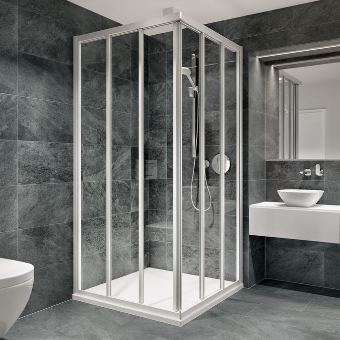 Душевое ограждение DUSCHOLUX Allegra, угловой вход, 2 раздвижных двухсегментных двери, 900х900х1900 мм, серебристо-матовый/TSG clear CareTec (426407790751070)