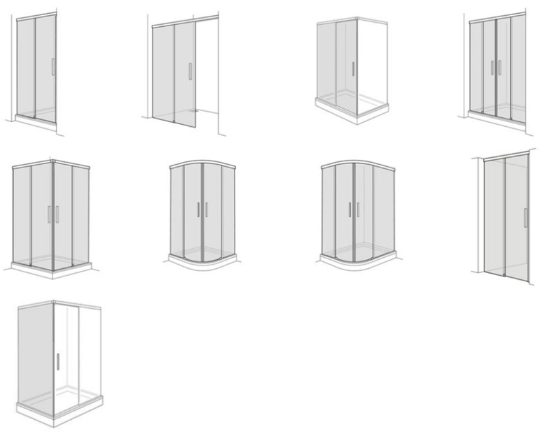 - Частично обрамленное душевое ограждение с толщиной стекла 8 мм (неподвижные части) и 6 мм (дверные сегменты)