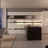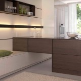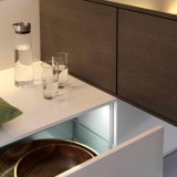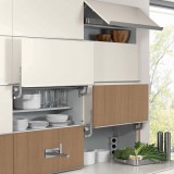 В программе реализован современный принцип организации пространства кухни: видоизменив привычный вид шкафов над рабочей поверхностью, создана вместительная зона для хранения. Разработана специальная вытяжка для встраивания в нишу.